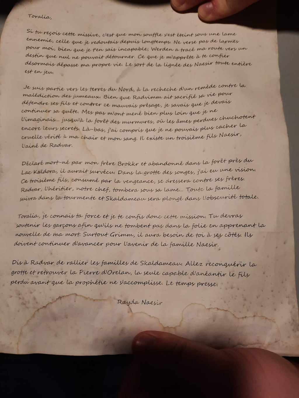 MISSIVE ENVOYÉ À TORALIA, DE LA PART DE LA MÈRE DES JUMEAUX Toralia a reçu une missive venant de la part de la mère de son bien aimé et tendre Époux, elle l'aurait transmise à Radvar, Grimm et Brokkr. Rayda (la mère de Radvar et de l'amoureux de Toralia) est décédé dans des circonstances mystérieuse et tenait à ne pas emporté avec elle un lourd secret familial: Les jumeaux seraient en fait 3 et le 3e qui est caché on ne sait où, serait le tueur de Radvar dans un avenir dont on ne sait quand, selon une vision que Rayda aurait eu dans une grotte: